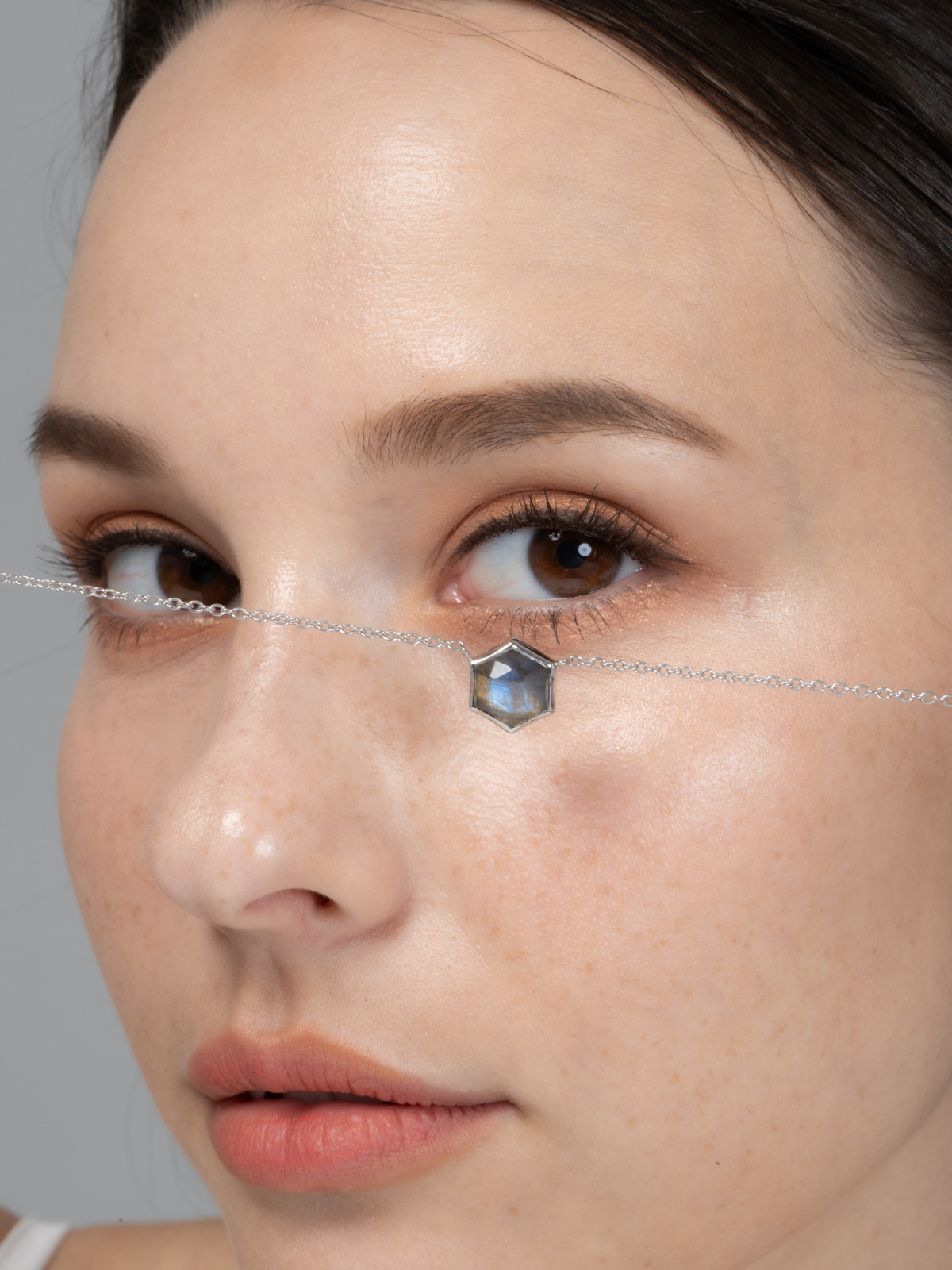 This Labradorite Necklace is absolutely enigmatic! Featuring a unique hexagonal rose cut labradorite, the beautiful gemstone glimmers with the most beautiful iridescent blue and purple hues* when it catches the light.