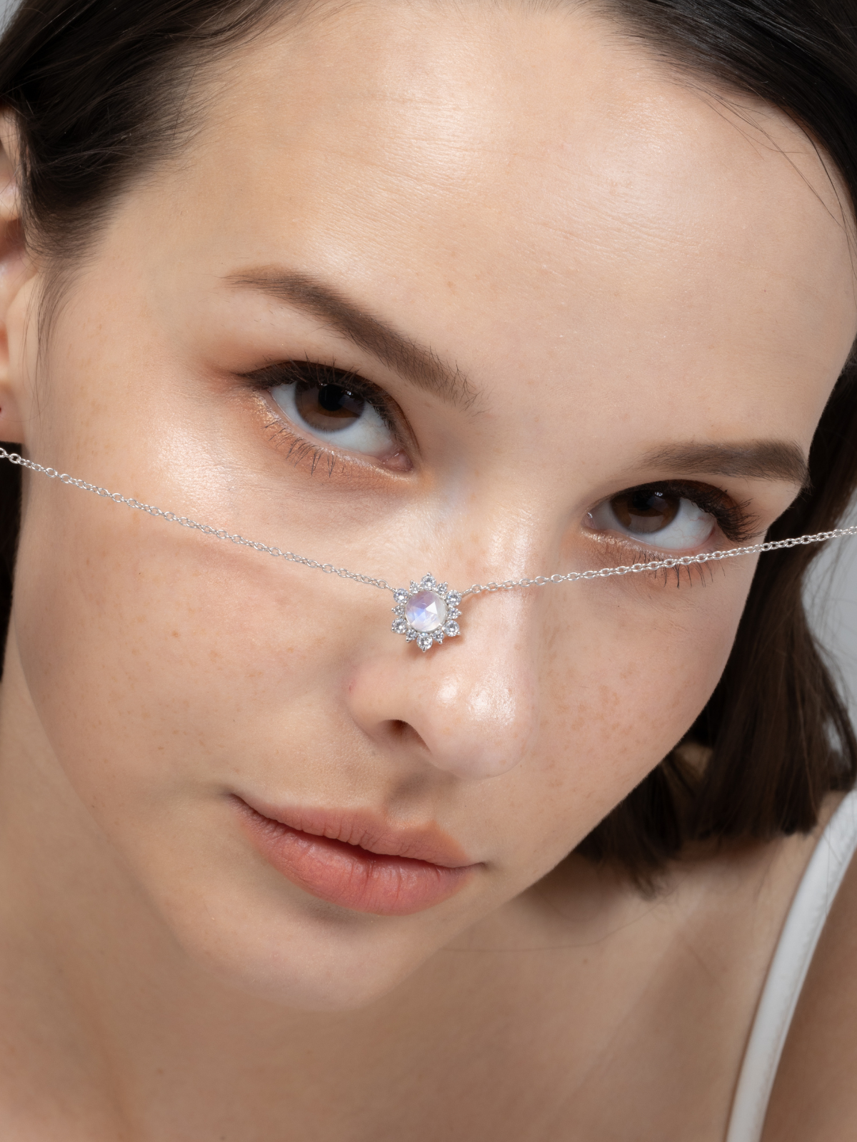 This Rainbow Moonstone Necklace is absolutely mesmerising! Featuring a unique rose cut rainbow moonstone at the centre and adorned with sparkly simulated diamonds, the beautiful moonstone glimmers with the most beautiful iridescent blue and purple hues* when it catches the light.